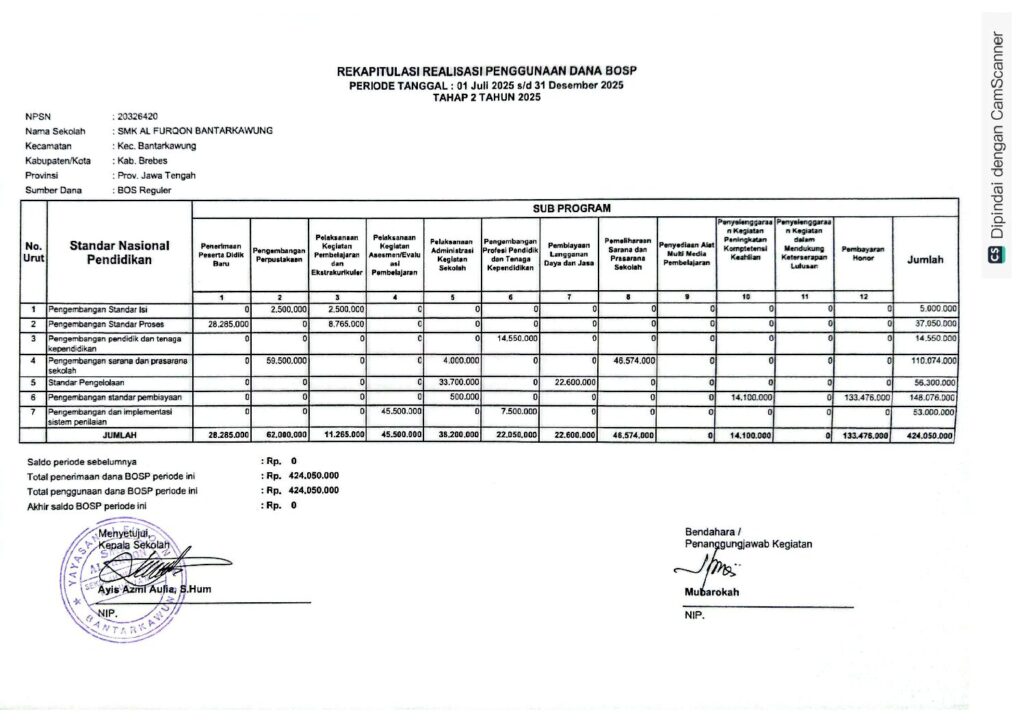 Rekapitulasi Realisasi Penggunaan Dana BOS Reguler Tahap 2 Tahun 2025 di SMK Al Furqon Bantarkawung….